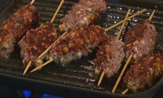 Разогреть в сковороде-гриль оставшееся оливковое масло и обжарить кебаб со всех сторон до готовности.