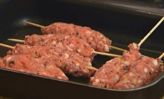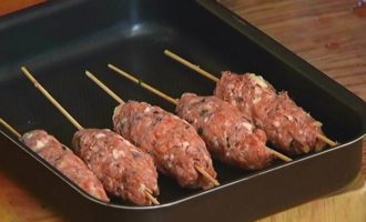 Сформировать на деревянных шпажках плотные колбаски из фарша и выложить их в небольшой глубокий противень.