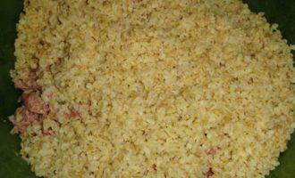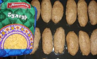 Булгур за 2 часа напитался водой. Лишнюю воду слить. Булгур добавить к фаршу.