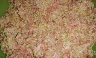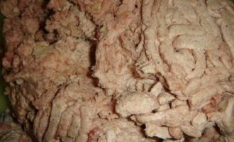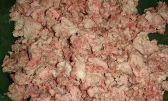 Пропустить фарш через мясорубку. Если фарш получился слишком сухой, добавьте немного водички и перемешайте.