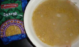 Сначала замочим булгур ТМ «Националь» в 2 стаканах холодной воды. Оставим на 2 часа.