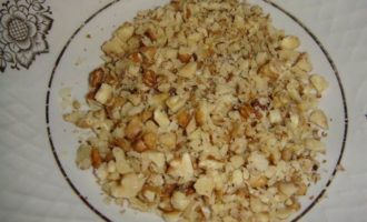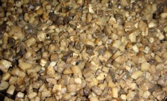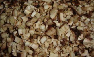 Грецкие орехи порубить ножом, добавить к остывшим грибам и перемешать.