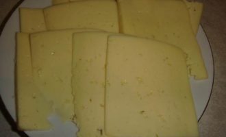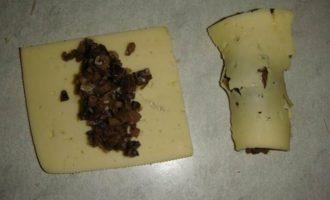 На кусочек сыра выкладываем грибы и сворачиваем в рулетик. Можно сыр нарезать брусочками. Я делала и так, и так, вкус от этого не меняется.