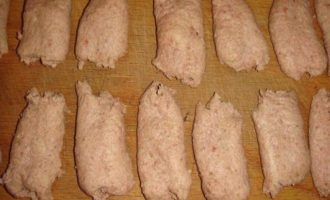 Устанавливаем в мясорубку насадку для кеббе и пропускаем через нее фарш. Отделять фарш пальцами. Если такой нет, можно лепить руками и делать внутри отверстие для начинки пальцем.