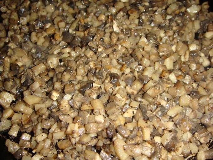 Грецкие орехи порубить ножом, добавить к остывшим грибам и перемешать.