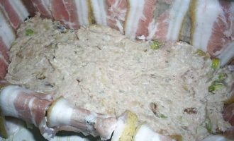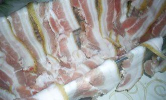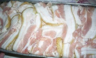 Теперь подготовим форму. Нам понадобиться вытянутая прямоугольная форма (у моей в сечении трапеция, а не прямоугольник). Чтоб облегчить себе жизнь можно взять сырокопченый бекон в нарезке. У меня его не оказалось, пришлось достать из морозилки свиной подчеревок и нарезать тоненькими пластинками. Кусочки бекона выкладываем внахлест, чтоб они покрывали дно и стенки формы и немного свешивались вниз. Кстати, шкурку с сала можно срезать.