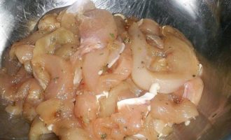 За 3-5 часов (а можно и за сутки) до начала приготовления блюда надо замариновать курочку. Для этого филе нарезаем вдоль волокон на тоненькие полоски. Кладем в миску, добавляем все ингредиенты для маринада, тщательно перемешиваем. Накрываем миску пищевой пленкой и отправляем в холодильник.