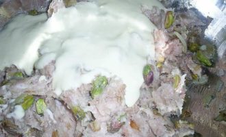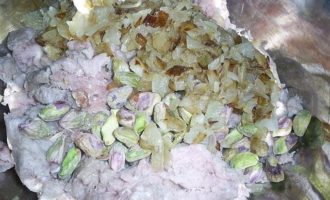 В миску с фаршем добавляем остывший обжаренный лук, очищенные фисташки (в рецепте указан вес неочищенных фисташек), а также соль и перец по вкусу. Все перемешиваем.