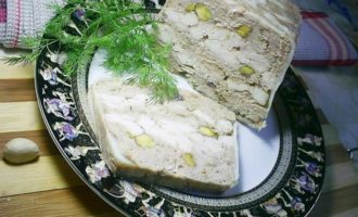 Накрываем фарш свисающими кусочками подчеревка. Отправляем в разогретую до 180 градусов духовку на 1,5-2 часа. Если сильно верх начнет румяниться, форму накрыть фольгой. Террин готов, если он отстает от стенок формы, а при его прокалывании вытекает прозрачный сок.