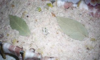 Теперь повторяем: вторая треть фарша, курочка, оставшийся фарш. Сверху кладем 2 лавровых листочка.