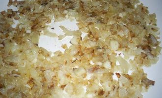 Крупную луковицу почистить и мелко нарезать, обжарить на сковороде на растительном масле до золотистого цвета. Добавить мелко нарезанный зубчик чеснока и обжарить вместе с луком еще пару минут.