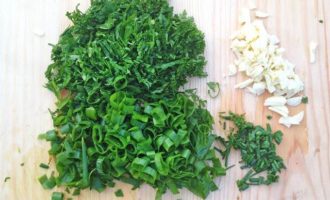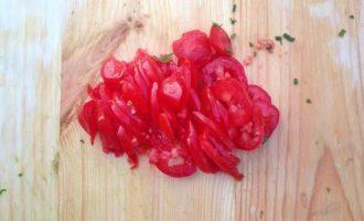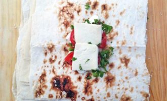 Каждый кусочек лаваша смазываем майонезом или сметаной. Посыпаем чесноком и зеленью. Раскладываем по паре кусочков помидора и сулугуни.