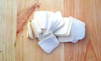 Сулугуни режем ломтиками толщиной около 0,5 см.
