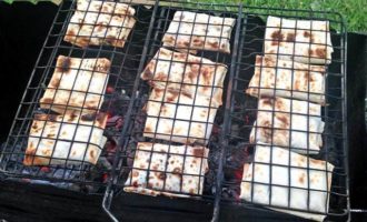 Укладываем на решетку и обжариваем на гриле или мангале по несколько минут с каждой стороны.