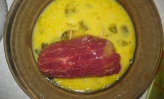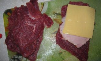 Отбить шницели из телятины. В каждый шницель заложить кружочек ветчины и сыр (лучше эмментальский сыр).