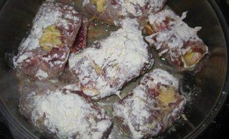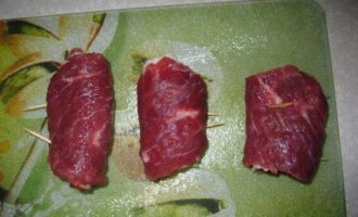 Завернуть, чтобы сыр оказался внутри и закрепить зубочистками. Немного посолить.