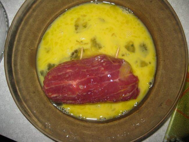 Отбить шницели из телятины. В каждый шницель заложить кружочек ветчины и сыр (лучше эмментальский сыр).