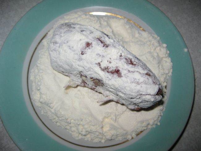 Завернуть, чтобы сыр оказался внутри и закрепить зубочистками. Немного посолить.