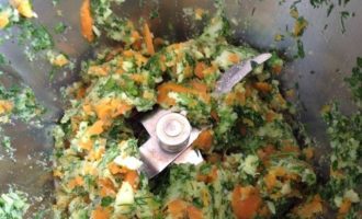 • После чего добавьте чечевицу и измельчите все в пюре. Приправьте куркумой, перцем, посолите, добавьте муку и хорошо перемешайте.