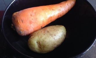 • Картофель и морковь тоже нужно сварить, я делала это в микроволновке: 6 минут полная мощность. Затем овощи почистите.