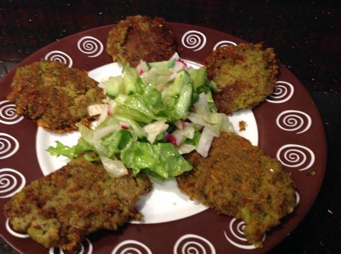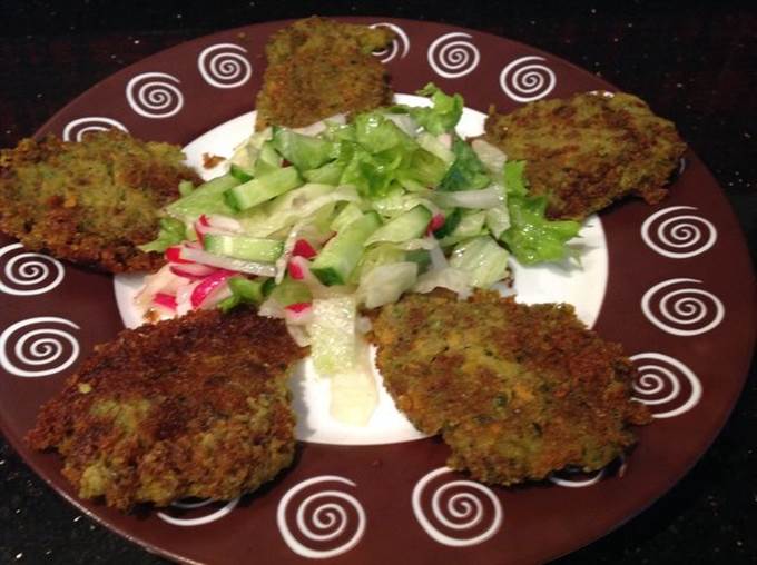 • Обжарьте с двух сторон на растительном масле, выкладывая котлетки ложкой на сковороду. Подавайте с любым овощным салатом, у меня самый простой: порвите листья салата, огурец и редиску нарежьте соломкой, посолите, добавьте растительное масло и хорошо перемешайте.
