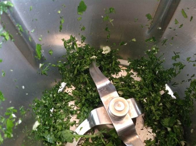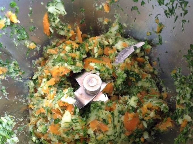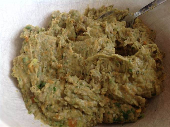 • После чего добавьте чечевицу и измельчите все в пюре. Приправьте куркумой, перцем, посолите, добавьте муку и хорошо перемешайте.