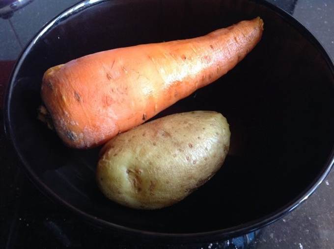 • Картофель и морковь тоже нужно сварить, я делала это в микроволновке: 6 минут полная мощность. Затем овощи почистите.