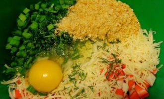 • Соединить все ингредиенты, добавить яйца и майонез для скрепления всего в однородную массу.