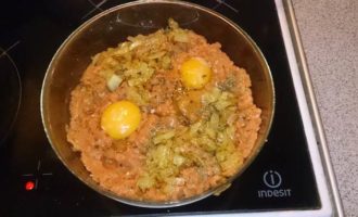 Смешиваем лук с фаршем, добавляем яйца, тимьян, соль, перец и тщательно перемешиваем.