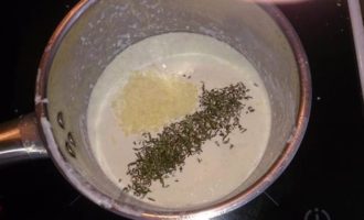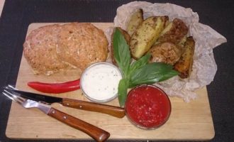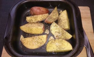 Картофель нарезаем крупными дольками, поливаем оливковым маслом, добавляем чеснок, посыпаем прованскими травами и крупной морской солью и перцем.