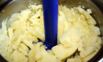 Картофель отварить в подсоленной воде. Если рыба слишком солёная, то количество соли в картофеле сократить. Воду слить и размять картофель со сливочным маслом.
