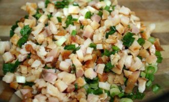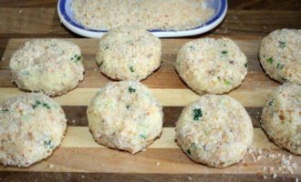 Соединить картофель с рыбой и смешать с перцем, яйцом и 2 ст. л. панировочных сухарей.