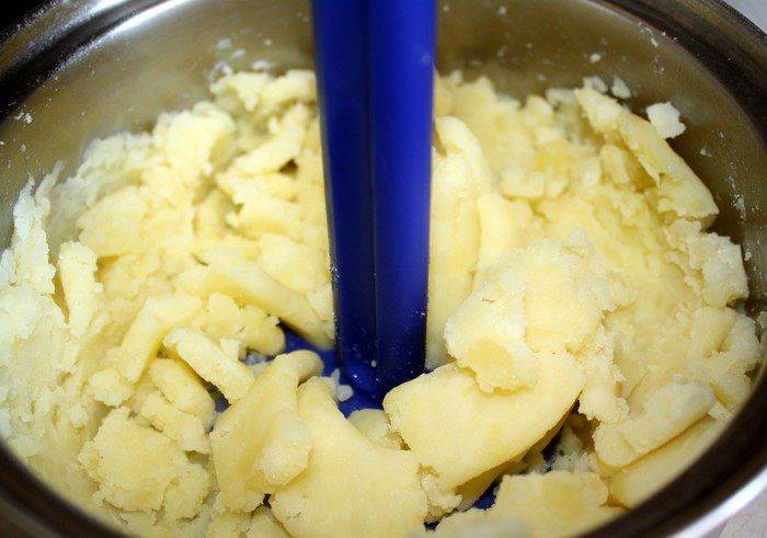 Картофель отварить в подсоленной воде. Если рыба слишком солёная, то количество соли в картофеле сократить. Воду слить и размять картофель со сливочным маслом.
