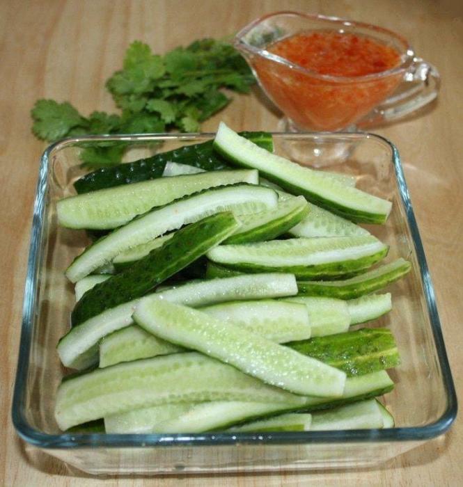 Огурцы нарезать вдоль на 6-8 частей. Имбирь и чили измельчить в блендере или мелко нарезать. Смешать соль, сахар, чили, имбирь и сок лаймов (лимона). Залить огурцы маринадом, убрать в холодильник, периодически переворачивая их в маринаде.