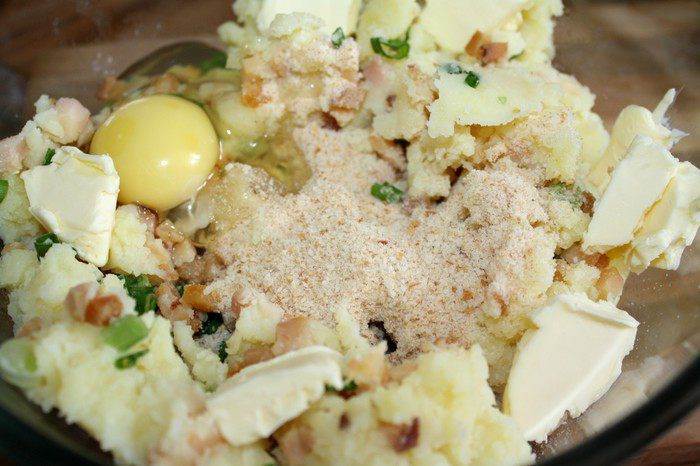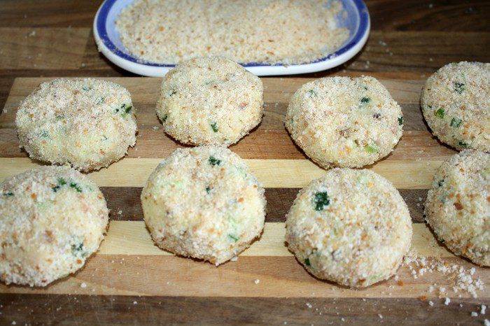 Соединить картофель с рыбой и смешать с перцем, яйцом и 2 ст. л. панировочных сухарей.