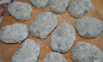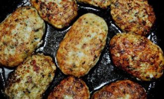 Из полученного фарша сформировать котлеты круглой или овальной формы, обвалять в муке или сухарях и обжарить в хорошо разогретом раст. масле с двух сторон о золотистой румяной корочки.