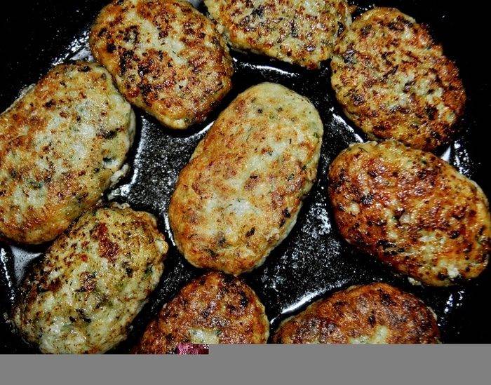 Из полученного фарша сформировать котлеты круглой или овальной формы, обвалять в муке или сухарях и обжарить в хорошо разогретом раст. масле с двух сторон о золотистой румяной корочки.