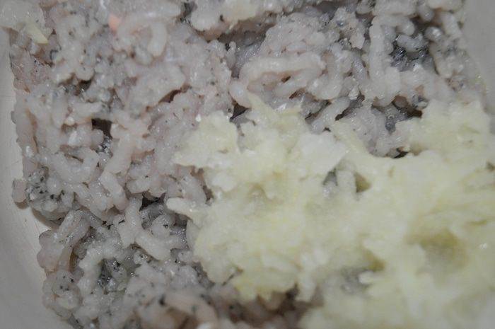Хлеб отжать, добавить в рыбный фарш, по желанию можно добавить одно сырое яйцо (я не добавляю), посолить, поперчить, хорошо перемешать. -