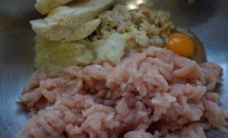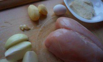 Грудку куриную моем, отделяем от костей, режем. Готовим все ингредиенты: лук, чеснок, яйцо, картофель (я взяла две картофелины сырые и одну вареную), батон предварительно замочила в молоке.