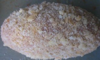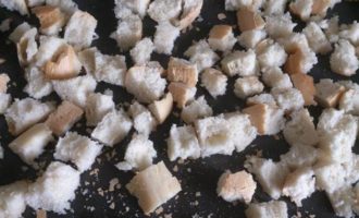 Батон подсушить в духовке и измельчить в крупную крошку.