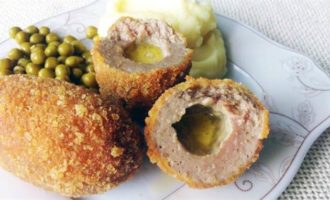 В правильно приготовленной котлете панировка не отслаивается от мяса, а масло находится в жидком состоянии. Это просто невероятно вкусно! В классическом варианте котлета подавалась с картофелем фри, либо пюре и зеленым горошком.