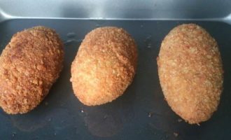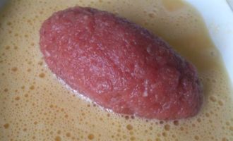 Слепить котлетку в форме дирижабля, тщательно залепить шов. Обмакнуть котлету в яйцо.
