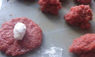 Разделить фарш на 11 частей. На одну котлету получается около 100 г фарша. Размять в лепешку и смазать немного яйцом. Кусочек масла обвалять в муке и положить в середину.