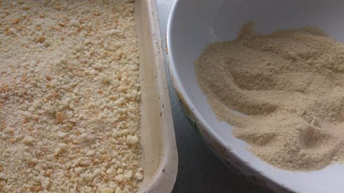 Батон подсушить в духовке и измельчить в крупную крошку.