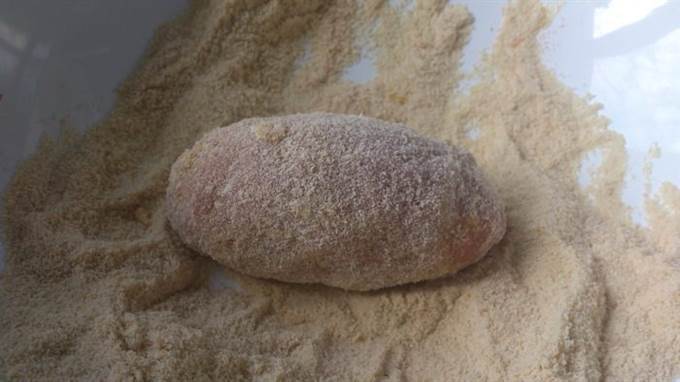 Слепить котлетку в форме дирижабля, тщательно залепить шов. Обмакнуть котлету в яйцо.