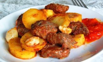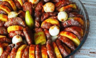 Немного томатного концентрата разводим водой, поливаем соусом подготовленное для выпечки блюдо. Ставим в разогретую до 200°С духовку, прикрыв фольгой, сначала на полчаса.