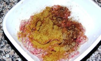 Выложить в миску фарш, добавить 2 горсти хлебных сухарей (можно пару высушенных кусков хлеба размочить в воде, потом лишнюю воду отжать), измельченную большую луковицу, чеснок, специи, соль.