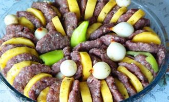 Выкладываем котлеты и овощи на блюдо для запекания, чередуя: котлета-картошка-лук и так далее (можно оставить только картофель и котлеты). У меня в этот раз был лук-шалот. Чеснок раскладываем в промежутки. -