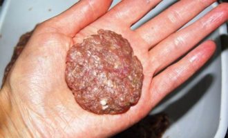 Фарш хорошо вымесить. Слепить небольшие котлетки круглой формы. Их надо немного приплющить, чтобы стали плоскими. Складываем котлетки в миску и отставляем в сторону.