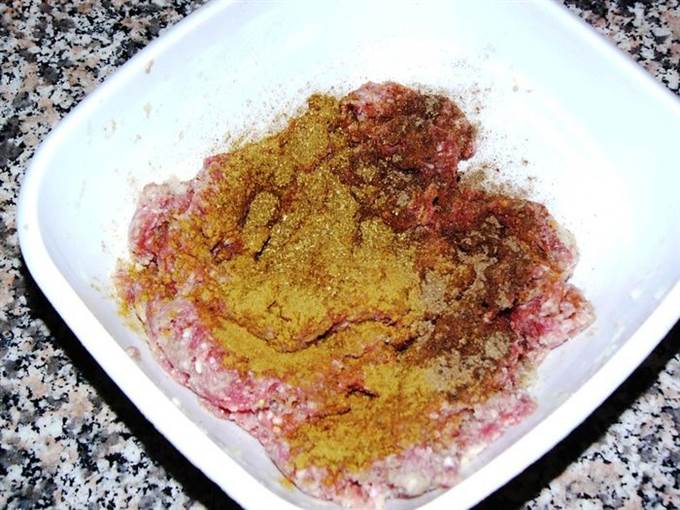 Выложить в миску фарш, добавить 2 горсти хлебных сухарей (можно пару высушенных кусков хлеба размочить в воде, потом лишнюю воду отжать), измельченную большую луковицу, чеснок, специи, соль.